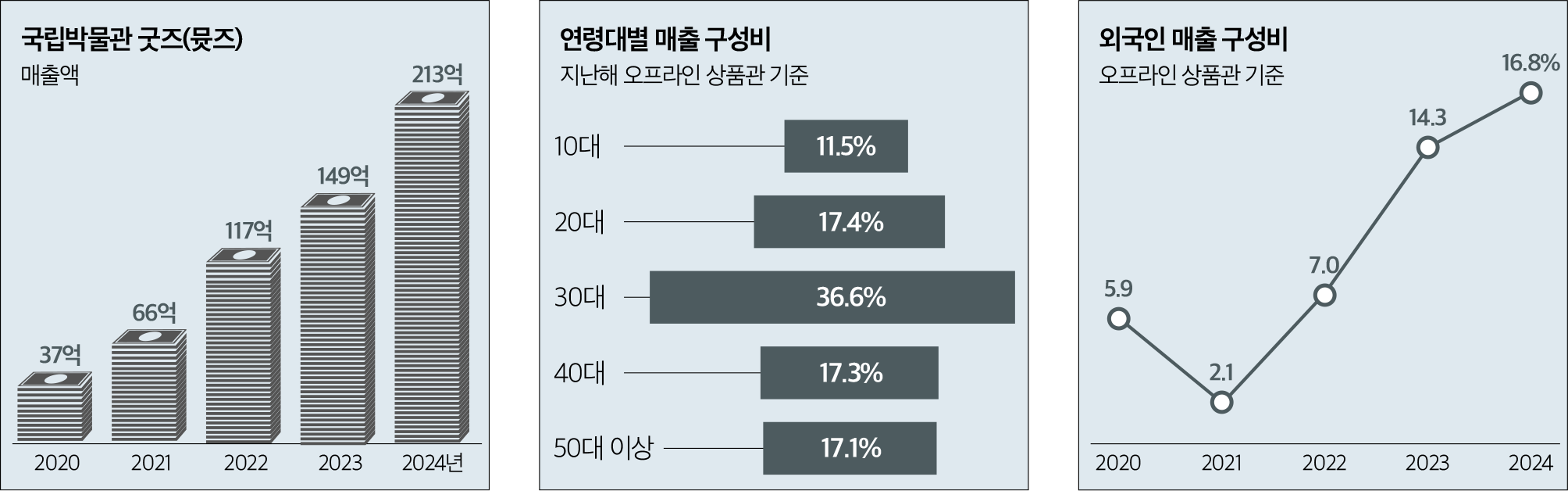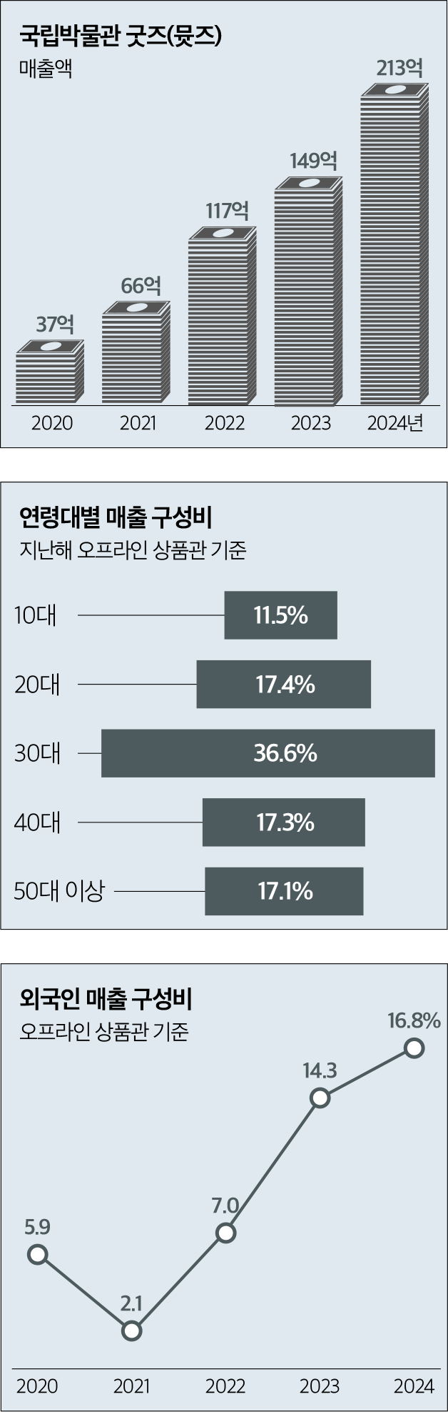 구매층은 주로 20~30대다. 지난해 국립박물관 상품관에서 뮷즈를 구입한 관람객 연령을 분석했더니 30대가 36.6%로 가장 많았고, 이어 20대 17.4%, 40대 17.3%, 50대 이상 17.1% 순이었다. 박물관을 방문해 뮷즈를 사는 외국인도 늘고 있다. 2020년에는 박물관 상품관에서 뮷즈를 구입한 외국인이 전체 구매자의 5.9% 수준이었으나 점차 증가해 작년에는 16.8%를 차지했다. 재단 관계자는 “뮷즈가 단순 기념품을 넘어 박물관 흥행을 견인하는 효자 상품이 됐다”고 말했다.