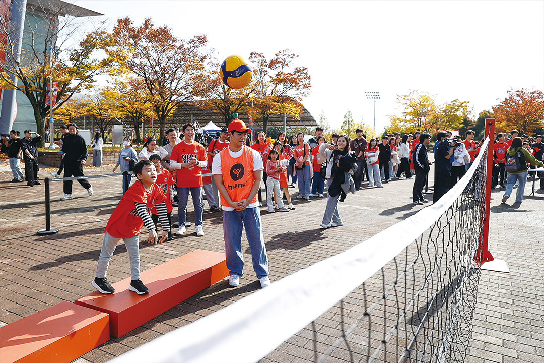 연고 이전 첫해, 구단이 가장 먼저 집중한 것은 부산 시민과 팀 사이의 새로운 접점을 만드는 일이다. 경기장에 오기 전부터 배구가 자연스럽게 친숙해질 수 있도록 도시 곳곳에 경험의 지점을 넓혀갔다. 시즌 개막 전부터 지역 축제에 배구 체험 부스를 운영해 직접 공을 쳐보고 점프·스파이크를 경험하게 했고, 부산 도심 백화점에서는 유니폼과 굿즈를 전시·판매하는 팝업스토어를 열어 “이제 부산에도 남자 프로배구단이 생겼다”는 메시지를 알렸다.