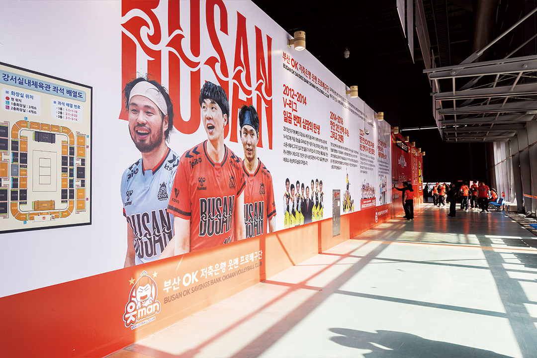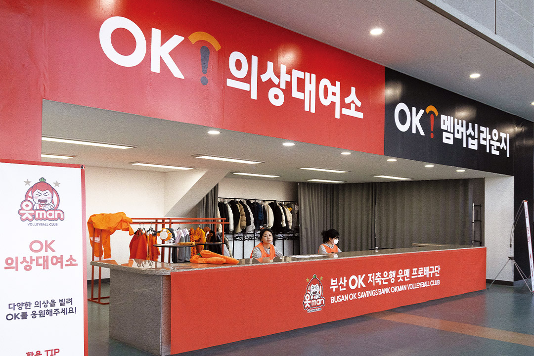 로비 한쪽 벽에는 창단부터 챔피언 등극까지의 역사를 정리한 대형 패널이 자리하고, 그 옆에는 “인구 330만 부산으로! 변화의 시작, 새롭게 출발하는 OK!”라는 문구와 함께 부산 이전의 배경과 목표를 소개하는 섹션이 이어진다. 팬들은 입장 동선을 따라 이 패널을 지나며 팀의 과거와 ‘부산 OK저축은행 읏맨’으로서의 현재를 자연스럽게 마주하게 된다. 강서실내체육관은 남자부 가운데 가장 큰 4,067석 규모를 갖춘 경기장이다. 좌석과 코트 간 거리가 짧아 시야 확보가 잘 되고, 관람 환경을 고려해 확충한 테이블석은 V-리그 남녀부 전체를 통틀어 가장 많은 수준이다. 접근성 역시 강점이다. 지하철 3호선 체육공원역에서 도보 5분 거리이며, 부산은 물론 김해 등 경남권 팬들이 이동하기에도 효율적인 위치다. 취재 당일 경기장을 찾은 황정민(24), 서수민(24) 씨도 김해에서 온 OK저축은행 읏맨의 새내기 팬이다. “최근 배구 예능을 보면서 관심이 생겼어요. 그런데 OK저축은행 읏맨이 부산으로 온다는 소식을 듣는데, 정말 반가웠어요. 이제는 차 타고 금방 오니까요. 유니폼에 ‘BUSAN’이라고 적힌 것도 너무 좋아요. 우리가 응원할 팀이 생긴 느낌이랄까요? 그래서 바로 멤버십도 가입했어요.”