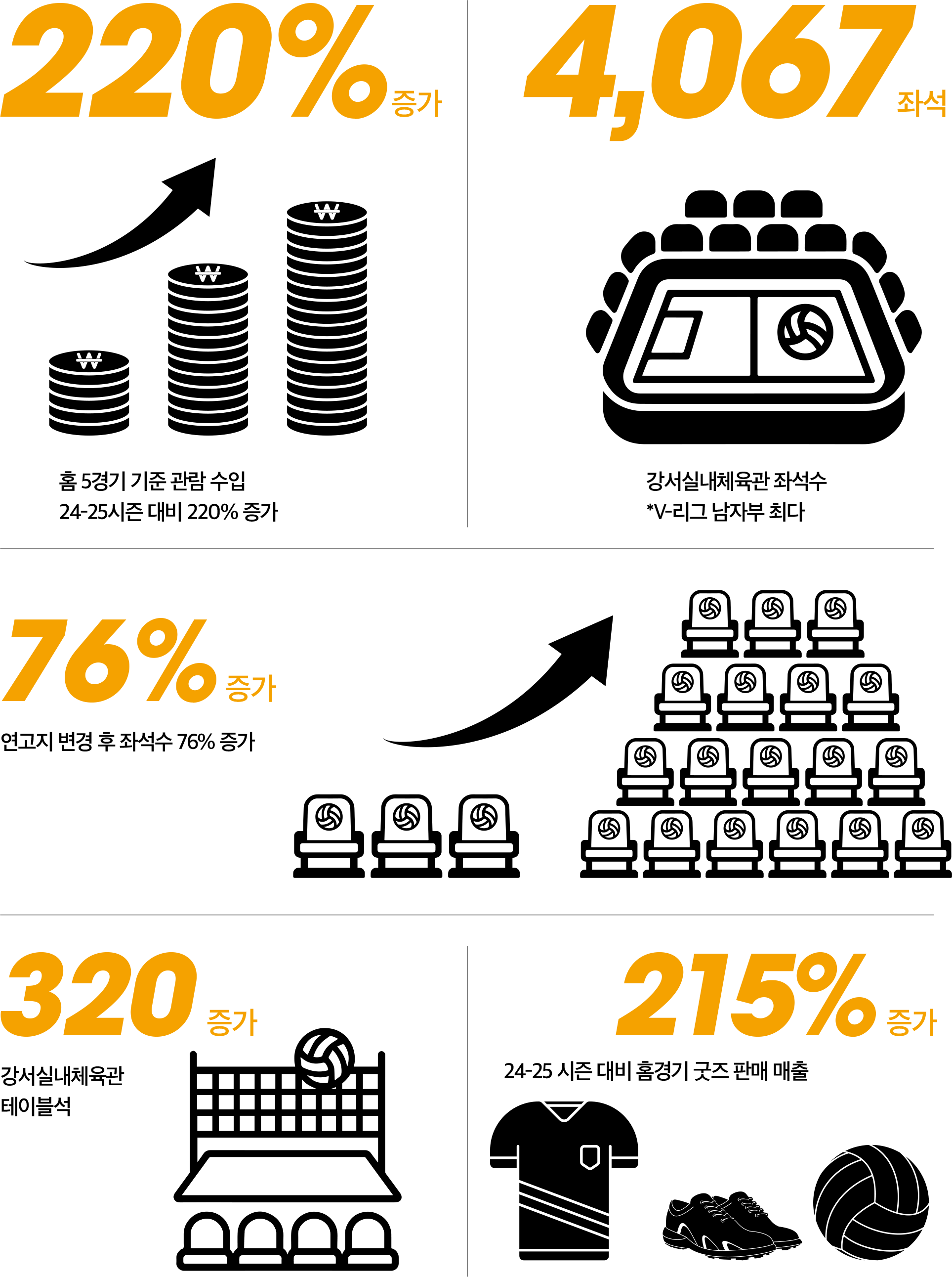 홈경기 날 강서체육공원은 하나의 축제 공간이 된다. 체육관 앞에는 푸드트럭이 줄지어 서고, 로비에는 점프·스파이크를 측정하는 배구 체험존과 포토이즘 촬영 부스, MD샵이 팬들을 맞이한다. 출석체크 이벤트, 특정 경기 테마 데이, 응원 티셔츠 증정 등은 시즌 안에서 다양한 경험을 제공하기 위한 장치로, ‘처음의 흥미’가 ‘다음 관람의 이유’가 되도록 하는 구단의 전략이다.